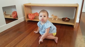 The infant shelf is low, so that the crawling or sitting infant can see the materials on top shelf. It is also the perfect height when they are at the pull up/stand stage.